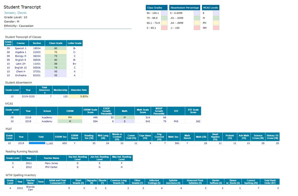 The student snapshot combines all of the grades, attendance, discipline, internal and external assessments in one location. The snapshot can be used for an individual student or in a class view.