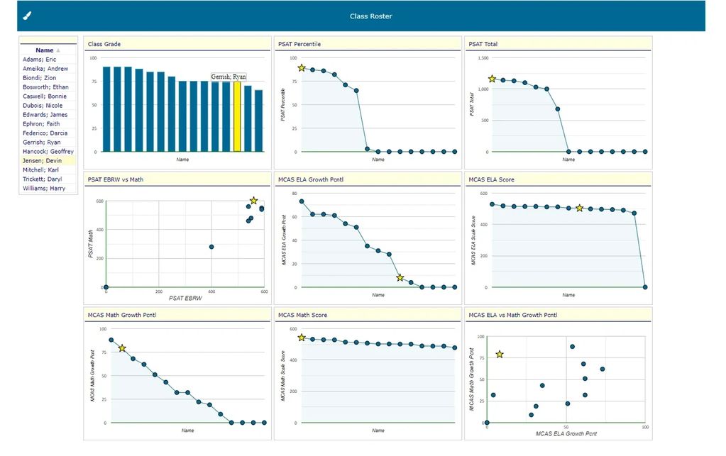 The Cohort Analysis allows users to see how an individual student compares to their peers. The class dashboard is composed of metrics such as class grades, standard assessments, behavior, and internal measures. Selecting a student from the class list will show their performance on all charts on the dashboard.