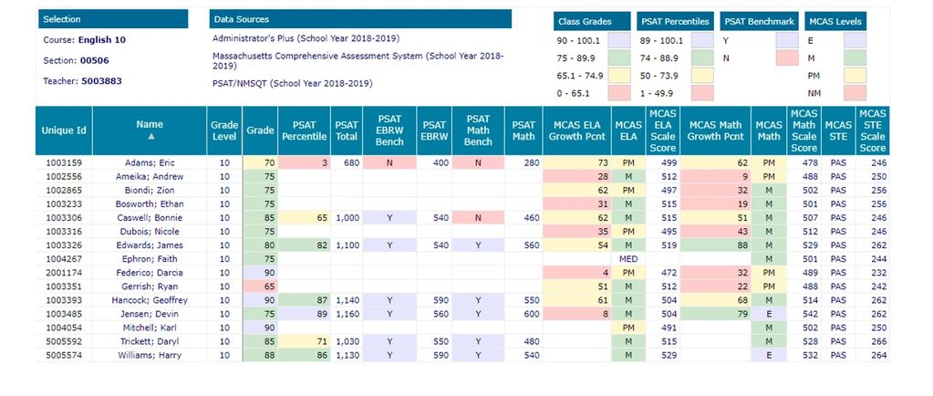 Teachers can track and monitor relative class and student data including: students of interest; assessment test results; skill/standards-based reports; students at risk of failure; attendance data; discipline data; and more. Identifying students that are struggling with specific concepts allows the school to recommend additional help from an interventionist.